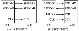 SPI通信有三线SPI和四线SPI两种模式。在三线SPI模式下,从属选择信号SS/STE不起作用;采用四线SPI模式时,SS/STE信号为高电平时禁止从机接收和发送数据,SS/STE信号为低电平时允许从机接收和发送数据。SPI通信是一种基于主从配置的通信,提供串行时钟信号的一方是主机,其他的为从机。图1为2种通信模式下2台单片机之间的连接图。如果一个系统中有多台从机,那么主机就要为每一台从机提供一个从属选择信号,以确保任一时刻只有一台从机起作用[1]。