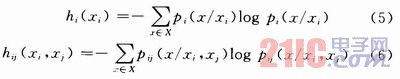 假定节点1与节点2感知数据的分布特性符合pi(x/xi),其中i为传感器号1或2,x(x∈X)为感知的随机数,xi为节点i感知的数据值;节点i和节点j的联合分布为pij(x/xi,xj),由信息熵的定义,节点i和j感知数据的自熵hi(xi)与联合熵hij(xi,xj)的计算如下: