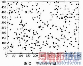 算法的仿真采用了300个节点,随机分布在500×500的平面区域,而基站位置为(250,250)。节点分布示意如图2所示。