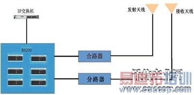 本工程规划使用6台XiR R8200数字中继台,通过6根网线与交换机连接,构成12个逻辑信道池。通过合路器将发信端合路,分路器将收信端分路,室内天线、室外天线分为两路分别完成发射和接收信号。