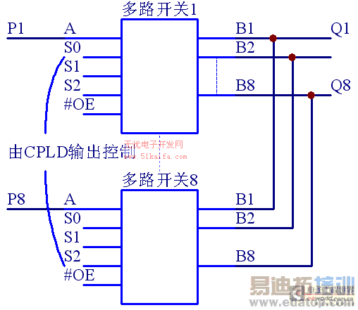 如图6的多路开关的结构所示,对每一个数据开关,用CPLD控制选通信号S0、S1、S2,可以把A连接到B1到B8中的任意一个。把八个多路开关的每一个输出相对应地连接起来,如图7,就可以把P1到P8中任意一个连接到Q1到Q8中的任意一个,也就是实现了8X8的可配置互连,而且可以任意方向传输数据。通过编程来改变CPLD的输出,控制数据开关的选通信号,就可以实现随机方向信号的可配置互连。
