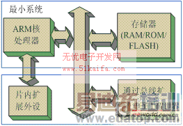 图2是基于ARM核处理器的嵌入式系统的框图。该系统分成两个部分,一部分是最小系统,由嵌入式ARM核处理器和存储器组成;另外一部分包括从嵌入式处理器片内外设接口直接扩展的外设和通过总线扩展的外设。为了充分利用模块化设计方法,这些部分应该能够通过灵活的互连组成一个平台。灵活的互连功能由互连模块完成。