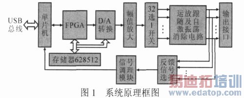 信号源的工作过程如下:计算机发出命令和波形数据,通过USB 总线传送给USB 接口芯片,经高速串行总线下传到单片机C8051F060,单片机对其接收到的指令和波形数据诠释后下传给FPGA,由FPGA 完成数据存储、D/A 转换、功能指示及其他逻辑控制。D/A 转换后的模拟信号经调理电路后输入到32 选1 开关电路进行选通,再经运放跟随和自激振荡消除电路处理后即可输出。信号输出的同时再输入到反馈信号选择电路,由C8051F060 自带的16 位AD 采集反馈信号,与理论值进行比较并动态调整,组成闭环控制系统,以提高输出信号的精度。
