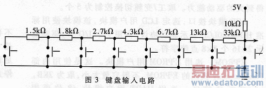 键盘输入,通过一I/O口,由一6位A/D转换器识别。这里选用8个按键,用以实现参数输入、时间核对、记录查询、通信等功能,电路如图3所示。图3所示各个电阻值,据A/D转换特点和常用电阻规格系列确定。