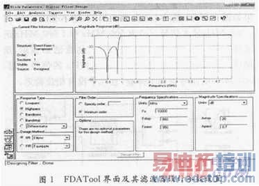 FDATool(Filter Design&Analysis Tool)是Matlab信号处理工具箱专用的滤波器设计分析工具,操作简单、灵活,可以采用多种方法设计FIR和IIR滤波器。在Matlab命令窗口输入FDATool后回车就会弹出FDATool界面,如图1所示。