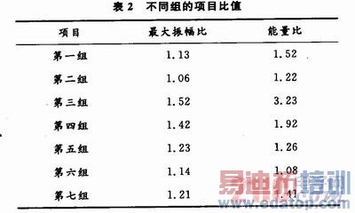 由第一组和第二组数据分析,对面积比α=0.46阶梯杆1和面积比α=0.65阶梯杆2,随着面积比α的增加,最大振幅比和能量比都减小,符合位移透射系数M=2/(1+α)随α增加而减小的性质。对圆锥杆3~6,其大小端面积相同,α为定值,由第三组至第六组数据可知,随着锥度的减小,其最大振幅比和能量比都减小。其原因在于这里的假设是完全弹性体,没有能量的损失,而实际金属介质并非完全弹性体,除了弹性外还有粘性和塑形,内部还有少量杂质和缺陷,这些都会引起能量的损耗。设单位体积的能量损耗一定,对圆锥杆而言,锥度愈小,其体积愈大,波在其传播时,损耗也愈大。这就解释了相同面积比,不同锥度的圆锥杆对信号的放大情况不同。从第一、三、四组数据可以看出,相同面积比的阶梯杆1和圆锥杆3,4,圆锥杆的最大振幅比和能量比都比阶梯杆1的大些。比较第三组和第七组数据,杆3和杆7为相同的高度和小端面积,但杆3的大端面积比杆7大,其最大振幅和能量比也比杆7大。