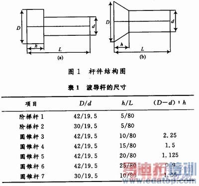 为了研究不同结构形状的导波杆对声发射信号的放大情况,采集经过不同结构的导波杆信号,利用能量、最大振幅二个参数研究其放大规律。所以设计了一系列不同结构的杆来研究其放大规律。如图1所示,(a)为阶梯形杆,(b)为圆锥形杆,尺寸见表1。