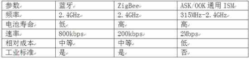 表1:蓝牙、ZigBee 和ASK/OOK特性的比较