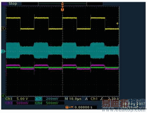 馈入到FRIN管脚的射频信号在外部采用交流耦合的方式。由于MAX9933是峰值响应射频检测器,因此它的基本功能是简单包络检波器,即使是对于低至毫伏的信号。用于输入射频电压幅值相对于输出直流电压的对数转移函数具有正比于dB的特性,因此MAX9933对非常小的信号非常敏感,使得ASK接收器能轻松区别输入的1和0信号电平。电容CCLPF的值决定了芯片输出端的响应带宽,该值又取决于预期的数据速率。图2给出了在将功率检测器当作包络检波器进行测试时的输出波形,其中比较器使用了一个自适应基准来产生数字输出位。测试波形具有10MHz的载波频率和40kbps的数据速率。CCLPF滤波电容为150pF,RC滤波器由一个100kΩ电阻和一个0.22μF电容组成。
