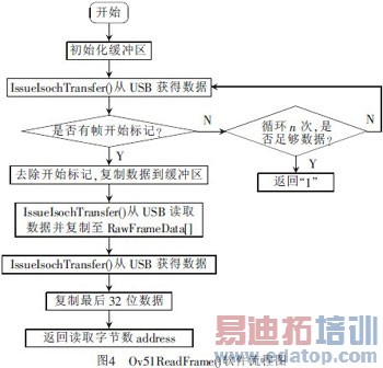 在每次得到一包数据时,查找帧开始标记,如果查找到,则复制剩余的所有数据到应用程序的缓冲中。在程序的Ov51xReadOneFrame()函数中,pDataBuff申请了9610B空间,dwFrameLen为10次传输每次的长度,这里都设置为961。图4为Ov51ReadFrame()软件流程图。