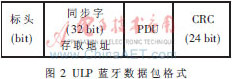 ULP蓝牙使用两种类型的地址[4]:设备地址和存取地址,设备地址细分为公有和私有设备地址。每个ULP设备应该分配一个固定48bit的ULP蓝牙公共设备地址,而私有设备设置的地址是可选的。ULP设备只有在证明设备可靠性后,才显示其私有地址;每个链路层的连接有一个伪随机32bit的存取地址,由连接中的申请者产生,每个链路层连接不同的存取地址。ULP蓝牙系统中,只能有一个数据包格式能在广播通道数据包和数据通道数据包中同时使用。如图2所示,每个数据包含4个实体:标头、同步字、PDU和CRC。广播数据包中的同步字是固定的,数据通道中的数据包同步字是链路层连接的存取地址。