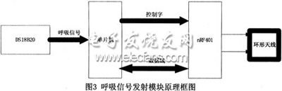 采用的nRF401是一个433MHZ ISM频段设计的真正单片UHF无线收发芯片,它采用FSK调制解调技术,nRF401最高工作频率可以达到20k,发射功率可以调整,最大发射功率为+10dBm。利用单片机对发射部分进行设置,通过发射模块将承载呼吸信号的数字信号发射出去,其原理框图如图3所示。
