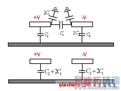 14、 当电容器量板间的距离与板子的宽度相当时,则边缘产生的电容与平行板形成的产生的电容相等。例如,在估算线宽为10MIL、介质厚度为10MIL的微带线的平行板电容时,其估算值为1PF/IN,但实际的电容约是上述的两倍,也就是2PF/IN。