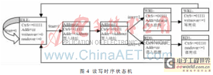 SJA1000 的数据和地址信号为时分复用,而FPGA 中不存在地址的概念,因此在读写寄存器时,要把SJA1000 中的寄存器地址当作数据写入。所以在系统的顶层模块设计中,将设计一个读写子模块来专门产生对CAN寄存器进行读写控制的时序,而核心主模块则只对通信流程进行描述。读写时序的状态机流程图如图4所示。在IDLE状态,对接口信号进行初始化,其中地址锁存信号ALE为低电平、写信号WR 为高电平、读信号RD为高电平、片选信号CS 为高电平、地址数据复用总线ADDR为高阻态、writeover和readover为低电平(writeover为高电平表示一个写时序的完成, readover为高电平表示一个读时序的完成) 。另外对于核心主模块的控制信号start和iswr,当start为低电平时继续在IDLE状态循环,反之则进入写地址状态Address0、Address1。然后根据iswr信号是高电平或低电平而进入写数据进程或读数据进程。读写数据过程均由两个状态完成,分别是RD0、RD1、WR0、WR1。当一个完整的读或写操作完成时,进入IDLE状态。每一个状态描述了ALE、WR、RD、CS、DIR1、ADDR的变化(OE0、OE1、DIR0分别为定值0、0、1,因此未列出来)。这里为了便于描述,设1为高电平,0为低电平,对以上几个信号在各个状态的值进行说明,将信号组{ALE、WR、RD、CS、DIR1}设为CtrS。