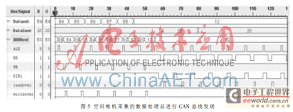 在FPGA中利用Verilog编程产生SJA1000的片选信号CS,地址锁存信号ALE,读写信号RD、WR。这些控制信号共同驱动SJA1000进行数据接收发送,同时产生OE0、OE1、DIR0、DIR1,来控制双向总线收发器。设计选取的是Xilinx公司Virtex系列的芯片,逻辑开发在ISE平台上进行。在FPGA的调试阶段,使用Xilinx提供的在线逻辑分析仪ChipScope pro来在线观察FPGA设计内部信号的波形,它比传统的逻辑分析仪更方便。图5就是在线进行数据传送时的波形。