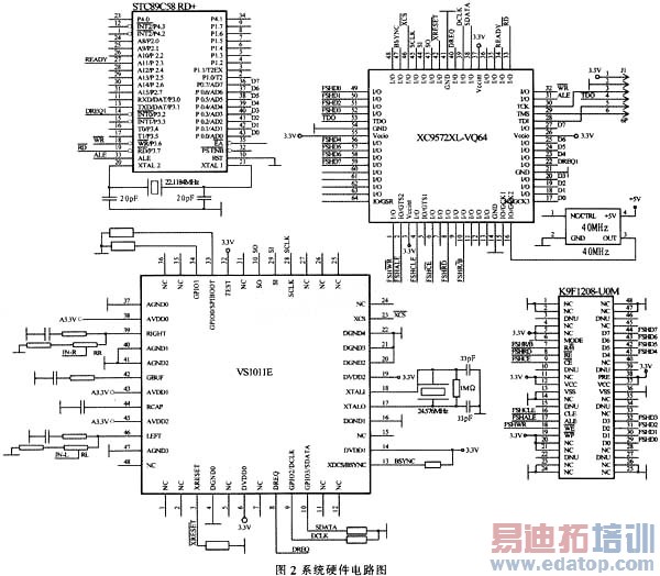 CPLD是微控制器、Flash和MP3之间的中介,负责逻辑控制和数据传递。CPLD电路采用Xilinx公司的XC9572-VQ64。XC9572-VQ64具有72个宏单元、1 600个可用门电路、52个I/O端口,具有低至2.5 V供电电源,可在线编程等特性。J1用于ISP下载。晶体振荡器采用40 MHz。