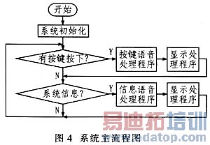 电梯在运行过程中,如果无人按键,电梯语音系统则自动播报广告、天气预报等信息,同时伴有点阵或液晶显示。当有按键按下时,语音系统则会根据按键值调用相应的按键语音处理程序。主程序流程图如图4所示。