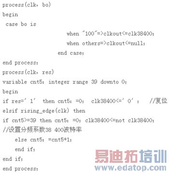波特率产生模块的主要功能:当输入不同数据时,将对输入的时钟信号有不同的分频比,从而产生不同的波特率。波特率发生器采用加法计数器来实现多种分频。产生38400b/s的VHDL程序如下: