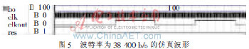 波特率为38400b/s的仿真波形如图5所示。其中,bo为波特率选择设置端口,将其分配给FPGA开发板的3个拨动开关,通过拨动开关输入相应的数据实现波特率设置;clk为系统时钟信号,频率为24MHz;res为复位端;clkout为输出时钟,提供给接收和发送模块,实现不同波特率传输。