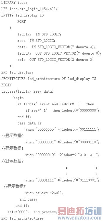 数码管显示模块的主要功能是将所接收到的数据在8bit七段数码管上进行显示。本设计中使用的是两个4bit一体、共阴极型的七段数码管。因此,数码管中被输入高电平的这一段将会被点亮,反之则不亮。应用数码管的这一特点,给数码管相应的段输入高电平,从而实现相应数据的显示。通过位选端口来控制,被选通的数码管显示数据,其余关闭。实现数码管显示的VHDL代码如下[6]: