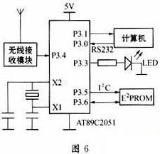 本设计的解码、安防接警中心电路原理图如图6所示,将经高频接收模块变频处理的数字脉冲信号送入AT89C2051(可参阅http://www.atmel.com)的P3.4 I/O口进行解码,再将满足E2PROM中地址码条件的数据通过RS232接口输出到计算机。图中省略了数字键盘和报警喇叭驱动电路部分。