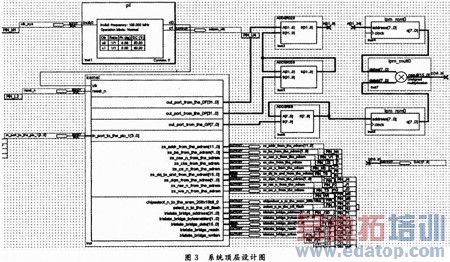 系统顶层设计图如图3所示。图中加法器通过QuartesⅡ软件直接用VHDL语言编写,波形ROM查找表则利用Matlab软件生成。