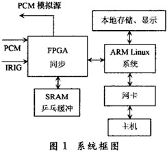系统设计框图如图1所示。其中,采编器或接收机解调输出的PCM信号及时钟输入到FPGA中进行帧同步,IRIG—B码信息也送到FPGA中进行解调,得到时间信息。数据与时间一起存入SRAM乒乓缓冲区中,达到一定大小后,FPGA向ARM处理器发器中断,ARM中运行的Linux系统,将数据取走,进行TCP/IP打包,发送给接收计算机。