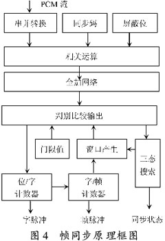 PCM数据按时钟进行串/并转换,与本地帧同步码进行同或运算后再与上屏蔽位,由全加网络将相关运算结果按位相加统计结果中1的个数,大于门限值则表示可能接收到了帧同步码。