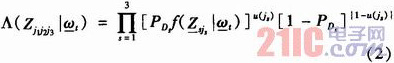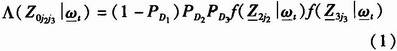 ,n=1,2,3的引入可以是在测量单个和两个节点传感器的检测目标交互中,把观测量看作是由3个传感器形成的观测量。若传感器j1在位置丢失目标,而传感器j2和j3的测量源于目标t,则这一情况的似然函数可表示为