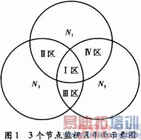 对于Zigbee节点N>2的多节点情况,所有节点不仅存在着共同的公共监视区,而且各节点间也可能存在局部公共监视区,如图1给出了Zi-gbee节点N=3情况下的公共监视区平面示意图。其中,I区为3个节点的公共监视区;Ⅱ区为节点N1和N2间的公共区;Ⅲ区为节点N2和N3间的公共区;Ⅳ区为节点N3和N1间的公共区。从示意图中不难看出,可以通过N1分别和N2、N3进行数据关联校验,然后再进行N2和N3数据关联校验,这样I区的轨迹多关联了二次;由于关联在数学上是等价关系,即对I区的轨迹而言,N1与N2关联校验一次之后,再对N2和N3进行一次关联校验即可。因此,N1与N3关联校验时可不考虑I区的轨迹,而只考虑他们之间的监视公共区(Ⅳ区)轨迹;对I区各节点公共区的轨迹也可以单独处理,有两种方法:一种是N1和N2关联,然后N3和N2关联,再运用等价关系的可传递性形成N个节点的共同关联轨迹。另一种方法是将其化成多节点分配问题,共同监视区轨迹处理完后,再分别处理两个节点间的重叠区的轨迹。这两种方法的优点是直观、简单、容易理解、工程上容易实现,当节点N较少时处理速度较快;但当节点N较多时处理速度成倒指数规律衰减,同时,这种处理方式缺乏严格的数学描述。所以,为提高分析轨迹关联的科学性、严密性,下面采用多节点分配方法探讨Zigbee多节点传感器数据融合中的轨迹关联问题。