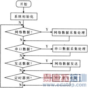 软件部分采用模块化的设计思想,把程序化繁为简,便于程序的设计、调试及维护。整个部分包括初始化模块、串口数据采集及处理模块、网络数据采集及处理模块和TCP/IP模块,另外还有定时器中断用于TCP的重发机制计时和数据采集计时、串口中断用于转发串口数据。