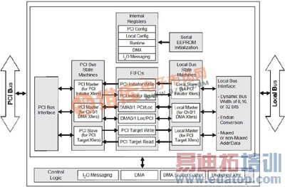PCI9054是PLX公司提供的一款PCI专用接口芯片,它兼容PCI V2.2的协议规范。其内部结构图如图1所示。由图可知,PCI9054实现的是PCI Bus端和Local Bus端的信号转换,使得Local Bus端不需要进行复杂的PCI协议逻辑的设计,只需要进行简单的数据传输逻辑的设计就能实现符合PCI协议规范的信号生成。