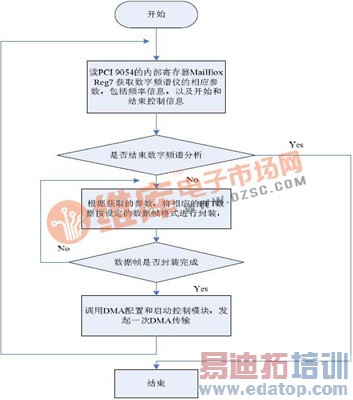 由于本系统的特殊应用,还需要增加一些上层的应用程序,才能实现整个数字频谱仪数据的正常工作,主要包括数字频谱仪的参数控制字的生成和写PCI9054内部寄存器MailBoxReg7,以及对接收的数据帧进行解封装的相关程序开发。