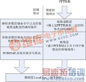 本文根据系统的特点,选择使用PCI DMA的传输方式。在FPGA端的程序采用层次化和模块化的设计,分为上下两层结构:下层是链路层,实现PCI DMA方式下,长字(4Bytes)数据流的双向传输链路的建立;上层是链路适配层,实现数字频谱仪的数据按照一定的帧格式封转成帧。PCI DMA方式的设置和启动也在FPGA中完成,程序采用模块化的设计方式,将数据传输模块与控制模块区分。在控制模块中,分成三层:第一层是寄存器读写层,实现对PCI9054内部寄存器的读写操作;第二层是参数获取与PCI DMA方式配置层,实现从PCI9054内部消息寄存器获取数字频谱仪的控制参数以及对PCI DMA方式进行配置与启动控制;第三层是上层控制层,用来解析控制参数以及控制生成数据帧。整个程序结构图如图3所示。