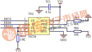 EEPROM电路的设计中需要注意EEDI和EEDO两个管脚的连接,电路原理图如图2所示。注意在没有挂载Local端的设备同时又没有EEPROM时,EEDI和EEDO需要通过一个1KΩ的电阻拉低。设计中,往往需要加上一个EEPROM用来存储对PCI9054芯片的内部寄存器的设置。这些设置在每次上电时自动进行加载,对PCI9054芯片的内部寄存器进行配置,使得每次上电后,PCI9054能按事先所配置的方式工作。因此,在设计电路完成之后还需要对EEPROM的内容进行设置,并通过PlxMon工具写入。