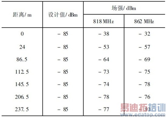 测试人员携带场强仪沿无源中继器信号覆盖方向对其进行测试,先将场强计计量单位设置为dB V,每到固定点进行记录,然后,将输入功率由+ 10 dBm转换成最小值0 dBm,将场强计测试数据的计量单位dB V 转换成dBm,实测数据整理后如表1 所示。