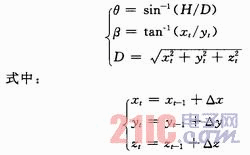 在雷达应用中,测定目标坐标常用极(球)坐标系统,空间任一目标的位置可用斜距D,方位角β,高低角θ来表示。在1.2节中为了简化,算出的都是单位时间增量△t内的坐标增量,但是在实际运算中,应该使用实时坐标值。假设目标在直角坐标系中的位置为(xt,yt,zt),则有:
