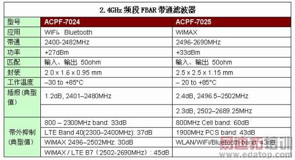 最近,AVAGO基于FBAR技术,针对2.4GHz频段的手机和移动无线产品推出了WiFi/Bluetooth带通滤波器 ---ACPF-7024,和WiMAX带通滤波器---ACPF-7025,其性能指标如表2。