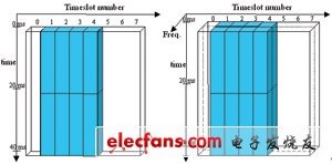DLDC意味着,同一个终端可以接收或发送独立载频上的两个载波(或是在跳频情况下的MAIO:s)。图4显示了一个示例,图左侧是4时隙单载波分配中的无线数据块,而图右侧是2×4时隙双载波分配中的无线数据块。这两个频率(在跳频情况下是MAIO:s)通常不相邻。