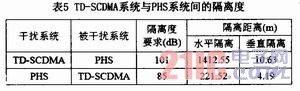 PHS系统(1 900~1 920MHz)对F频段(1 880~1900MHz)的干扰主要为杂散干扰,其杂散指标一般为一36dBm/100kHz。在F频段引入之后TD-SCDMA系统与PHS系统的干扰保护隔离要求如表5所示。
