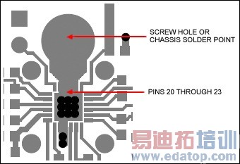 电路板设计需要在部件的裸焊盘至模块外壳之间具有低热阻。为实现这一目的,可将引脚20至23接地,使裸焊盘至外壳焊接点或通过这些引脚下方的通孔之间形成稳固的铜区域(图4)。部件集成了温度传感器,一旦管芯达到+135°C温度,则逐渐减小电流。部件在热保护时仍然保持工作。