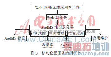地图服务器引擎是移动位置服务应用平台实现方案的核心,该模块的性能好坏将影响定位效果,可以直接选用商用化设备。开发定位服务器选用的地图服务器是ESRI的ArcIMS地图服务器,它包含以下几个部分:地理信息发布平台、空间数据库、地理编码、路径搜索。ArcIMS地图服务器提供二次开发接口,只需开发程序将移动位置服务网关计算出的位置传送给地图服务器,从而确定出移动终端所在的准确位置。ArcIMS地图服务器适用于无线互联网、企业Intranet的地图应用,能以多种图像格式发布地图,很容易建立基于无线手持设备(手机或PDA)可扩充的移动位置服务应用。对于电信级的定位应用,核心问题是解决大用户量的并发访问的问题,ArcIMS采用了先进的负载平衡和流量控制技术。当系统容量扩大时,只需增加地图服务器就可以满足用户的需求。