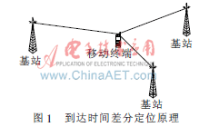 TDOA作为主要的定位技术在第三代移动通信网络中得到了广泛的应用。在3GPP的WCDMA中,基于TDOA定位技术,即观测到达时间差分OTDOA(Observed Time Difference of Arrival);在3GPP2的CDMA2000中,称为高级前向链路三角测量法A-FLT(Advanced Forward Link Trilateration)。这些方法的原理相同,都是通过信号到达时间差值,确定不少于两条双曲线,再通过这些双曲线的交点,确定移动台的位置。到达时间差分定位原理如图1所示。