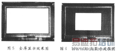 按上面的时序参数在SoPC系统中配置TFT_LCD液晶IP核后,设置屏幕背景为白屏,并在上面用黑线画一个矩形,显示结果如图5所示。如果将时序参数中的数据做如下调整,将横向有效显示数据设置为480点,纵向有效显示数据设置为360点,做同上的验证,显示结果如图6所示。由这两个图可见,该控制器具有很好的通用性。