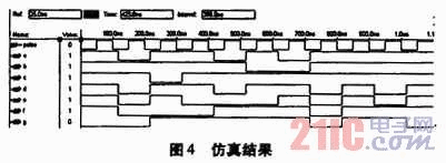 打开PC机界面MAX+plusⅡ软件,输入图3的电路图;选菜单File\Project\Set Project to Current File,然后选菜单MAX+plusⅡ\complier编辑当前图形文件;对图3进行仿真,仿真结果如图4所示。由图4知:所设计的电路(图3)符合十进制计数器的逻辑要求。