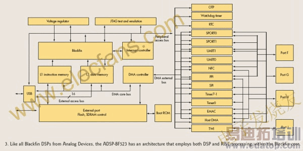 Blackfin处理器可配合多种微控制器型外设,包括10/100Ethernet MAC、UARTs、SPI、CAN控制器、支持脉宽调制(PWM)的定时器、看门狗定时器、实时时钟以及无缝的同步和异步存储控制器。