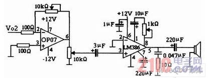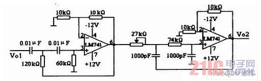 带通滤波器2如图7所示。放大器2和功率放大器如图8所示。图6、图7、图8连接起来就可以获得音频信号。