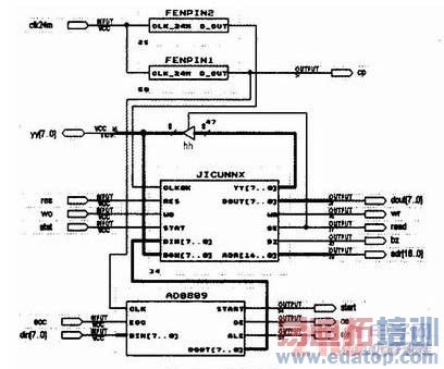 FPGA外部接线如图9所示。clk24m接24MHz晶振,cp接图4 ADC0809 ADC电路,yy[7..0]接图1.5 HM628128D,res接按键开关res为0时地址复位为0,wo接高低电平开关wo为0录音wo为1放音,stat接高低电平开关,开始录音或放音。dout[7..O]接图6,wr、read、adr[16..O]接图5HM628128D,bz接发光指示灯显示录音或放音工作状态,其余端接图4 ADC0809 ADC电路。