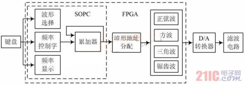 系统采用SOPC 设计方案。整体系统框图如图1所示,它由频率预置电路、波形选择、波形频率控制、累加器、存储波形数据的存储器和D/ A 转换电路、滤波电路组成。累加器模块由10 位加法器与10 位寄存器级联而成。波形存储器中放入正弦波、方波、三角波、锯齿波的数据。