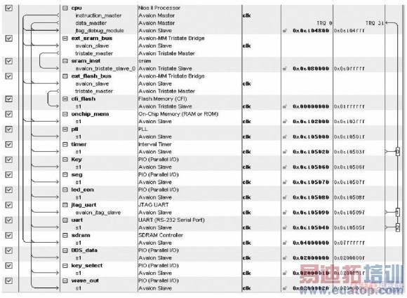 打开SOPC Builder 后分别添加CPU,PIO 输入( 10 个按键用作频率字的输入、1 个按键用作确认、4 个按键用作波形的选择) ,存储器( FLASH,SRAM 和SDRAM) ,PIO 输出( 10 位作为ROM 的地址、2 位作为ROM 块的选择、7 位为LED 段码、1 位为LED 的选通端) 和定时器。所有组件添加完后的硬件架构图如图3 所示。